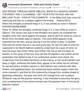 I just want to encourage everyone to, to stay suited up every day. I’m not saying this out of fear or worry, but I, I feel like us, as the army of God on earth, you know, that we need to make sure that we have on our armor of God every day, that, you know, we’re suited up, we’re in our seat of authority. So if you don’t know how to suit up every day and get into your seat of authority and, uh, in Christ, and, uh, get your family covered in the blood and get your family suited up … ‘cause if you have children or a husband or whatever or wife that doesn’t know how to put out their, on their armor of God or they don’t know how to put on their armor of God but you want to make sure, you know, they have it on, go to my website – Annamarie Strawhand dot com, go to Suit Up, and you can put on your armor of God, and then you can suit them up in the spirit. Okay? “
