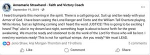 Faith Lane Team: WOW, Coach, this is soooooo incredible!!! I’m working on the prophetic updates for this week and I’m in ABSOLUTE AWE OF GOD at what he’s doing right now and how it all confirms in the prophetic words he’s been speaking through you for these past several years. It’s just amazing!!!