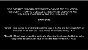 This prophetic word and revelation is happening! TRUMP IS RESTORING THE FORTUNES OF ZION AS PROPHESIED AND PROMISED OF GOD IN ISAIAH 54! PRESIDENT TRUMP IS THE ONE WHO GOD HIMSELF CREATED AND PLACED TO “WASTE AND DESTROY” THE ENEMIES OF GOD’S PEOPLE AND GOD HIMSELF HAS GIVEN PRESIDENT TRUMP THE WEAPONS. https://www.annamariestrawhand.com/trump-is-restoring-the-fortunes-of-zion-as-prophesied-as-promised-of-god/