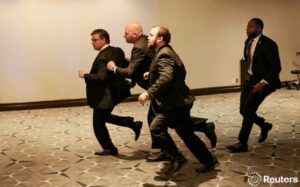 Caption: Image taken during the shooting at White House Correspondents’ Dinner shows security rushing House Speaker Mike Johnson out!