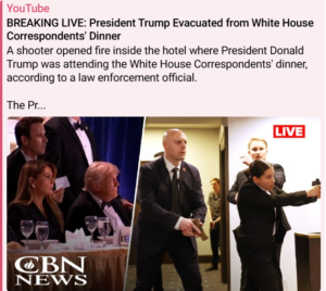 CBN News: A shooter opened fire inside the hotel where President Donald Trump was attending the White House Correspondents’ dinner Saturday night, according to a law enforcement official.