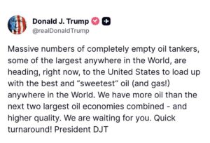 “Massive numbers of completely empty oil tankers, some of the largest anywhere in the World, are heading, right now, to the United States to load up with the best and “sweetest” oil (and gas!) anywhere in the World. We have more oil than the next two largest oil economies combined – and higher quality. We are waiting for you. Quick turnaround! President DJT”
