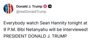 Caption: NEW – Trump tells “everybody” to watch Netanyahu’s Sean Hannity interview on Fox News tonight at 9 pm ET.