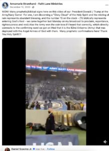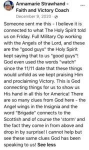 ANNAMARIE: “The Lord is saying that a huge military operation is going forth against the enemy, against the enemy of the people of America and it, this is, this is bigger than just the voter fraud. I mean, this is, this is like, this could be the big boom that God was talking about when He just, He just said full metal jacket like full assault, no holds barred, you know, just go with, you know, locked and loaded.