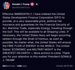 By offering U.S. government-backed insurance and guarantees, Trump is effectively saying that the flow of oil through Hormuz will not depend on private insurance markets in London.
