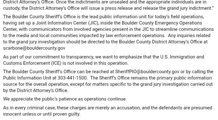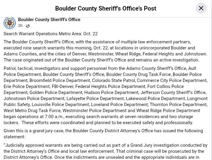 Faith Lane Team: Breaking news out of Boulder. Search warrants and arrest as part of a major Grand Jury investigation. More details will be released once they are all in custody.