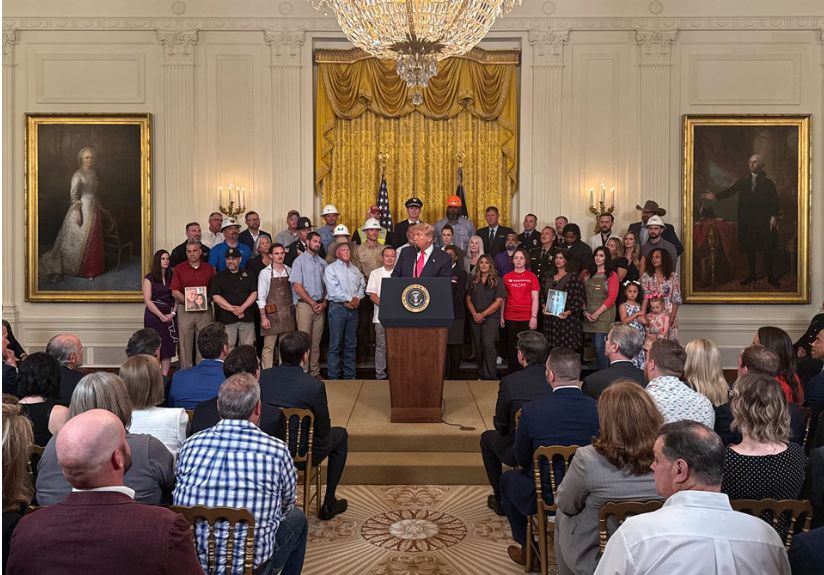 “Just because I won in a HISTORIC landslide and have unleashed the Golden Age of America, THAT DOESN’T MEAN WE CAN TAKE OUR FOOT OFF THE GAS!”