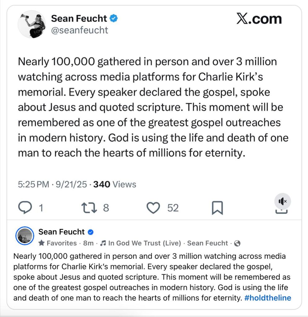 “The evil murderer who took Charlie from us expected us to have a funeral, but instead, we have had A REVIVAL in celebration of Charlie Kirk and of his Lord, Jesus Christ!”