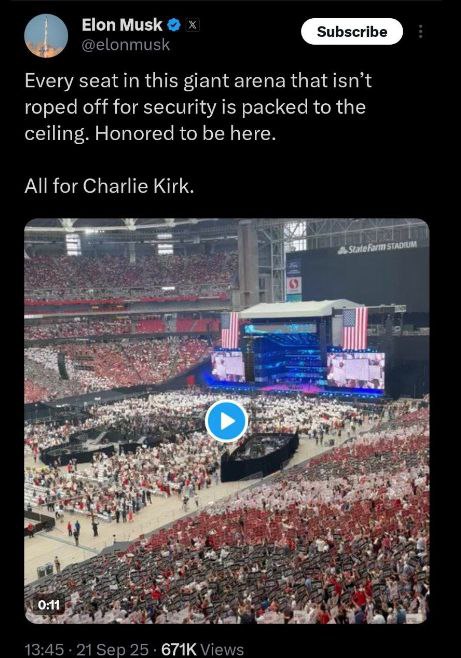 Caption: BREAKING: State Farm Arena is now 100% AT CAPACITY for Charlie Kirk’s memorial