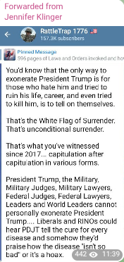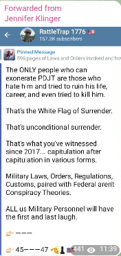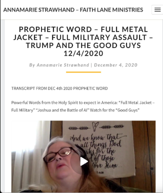 “So, um, I think that, you know, as we look at the people that are involved right now that, you know, the brilliant plan of God, you know, we were told the brilliant plan of God is going forth. We know that the brill, the brilliant battle plans of God were given to Joshua. Um, we know that, uh, there are military-type, brilliant military-type people and military-type lawyers all around President Trump, um, and we, you know, we’ve been kind of seeing these hints, and so if, if we’re seeing right now that the Lord is saying that a huge military operation is going forth against the enemy, against the enemy of the people of America and it, this is, this is bigger than just the voter fraud. I mean, this is, this is like, this could be the big boom that God was talking about when He just, He just said full metal jacket like full assault, no holds barred, you know, just go with, you know, locked and loaded.